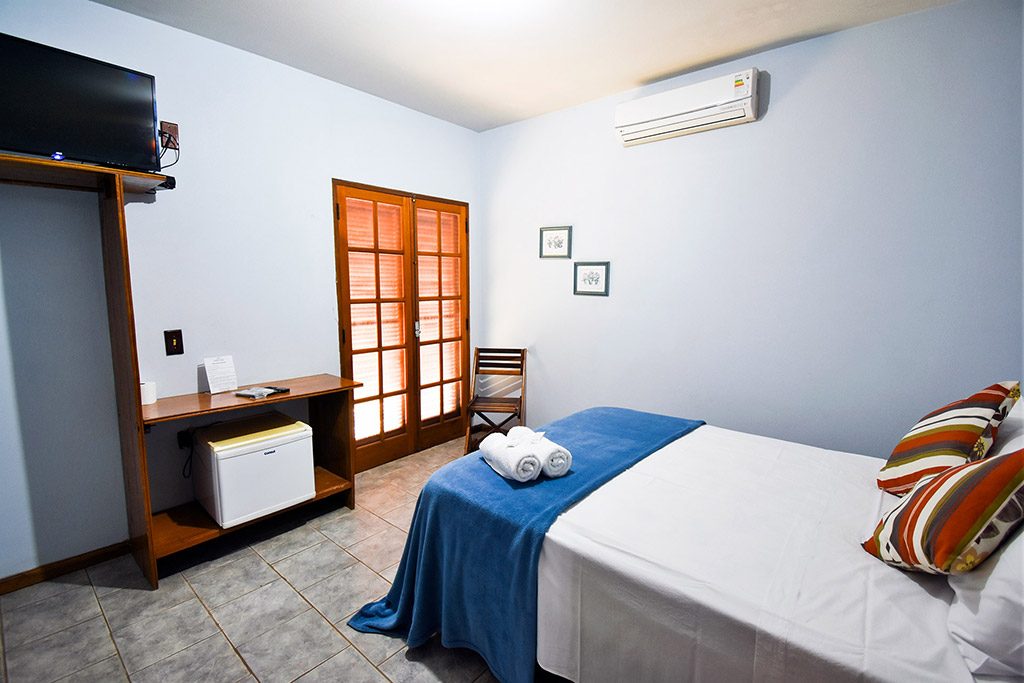 Apartamento completo com cama de casal box, ar-condicionado, frigobar, tv a cabo e banheiro privativo.