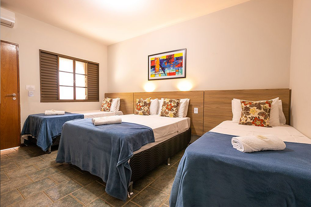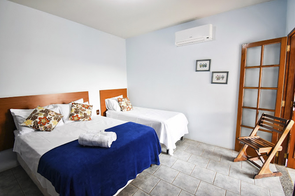 Apto para 3 adultos com uma cama box casal + 2 camas box solteiro , ar-condicionado, tv a cabo, frigobar e banheiro privativo.