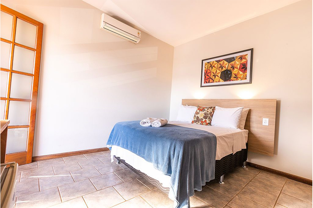 Apto para 1 adulto com uma cama box casal, ar-condicionado, tv a cabo, frigobar e banheiro privativo.
